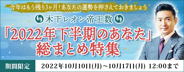 占い速報 『木下レオン◆帝王数』にて、『木下レオン帝王数 「2022年下半期のあなた」総まとめ特集』を開催中! 2022年9月11日 reviewers 占い.tokyo テレシスネットワーク株式会社(本社:東京都港区、代表取締役:鷹石惠充 https://www.telsys.co.jp/)は、2022年1 …